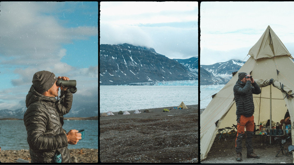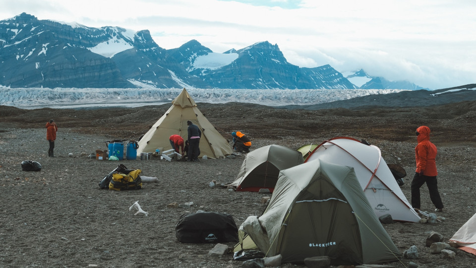 Tur, ledāja pakājē un pludmalē, mēs izveidojām mūsu pirmo nometni. Kas par skatu! Pirmās dienas bija pārsteidzošas un iespaidiem bagātas, jo pieredzējām pirmās virsotnes, pastaigu uz prātam netverami skaistu un varenu ledāju, ziemeļbriežus, kurus interesē mūsu klātbūtne, un rotaļīgās polārlapsas.